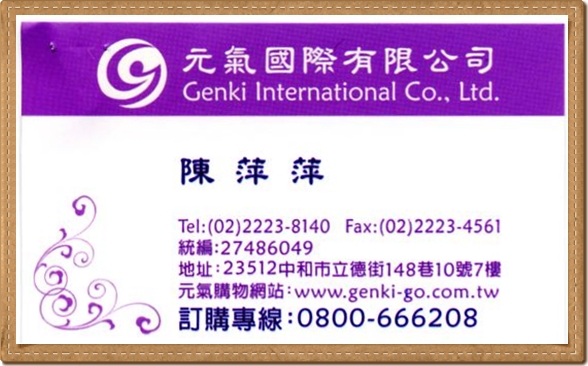 買東西當然希望愈快收到貨愈好,尤其是國際貨運,我很怕要等很久. 之前在 sasa.com 訂東西,約一個月才收到貨. 所以特地問了一下陳小姐,她說"大概10-13個工作天寄到,但很多客人1個禮拜就收到了^^". 我看完這句話,心想她講1個禮拜不知是真的假的,結果我下個星期一就收到貨了,非常開心,也覺得和她交易非常愉快. 因此決定在文章最後把她的名片貼上來,若有和我一樣住在國外,也想要訂購元氣堂的產品,建議可以找這位陳小姐.