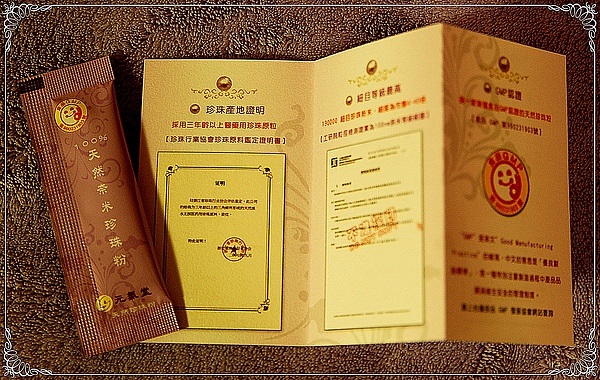 1.GMP 認證, 2.細目等級最高(13萬), 3. 珍珠產地證明, 4. 胺基酸檢驗證明, 5. 產品安心保證.