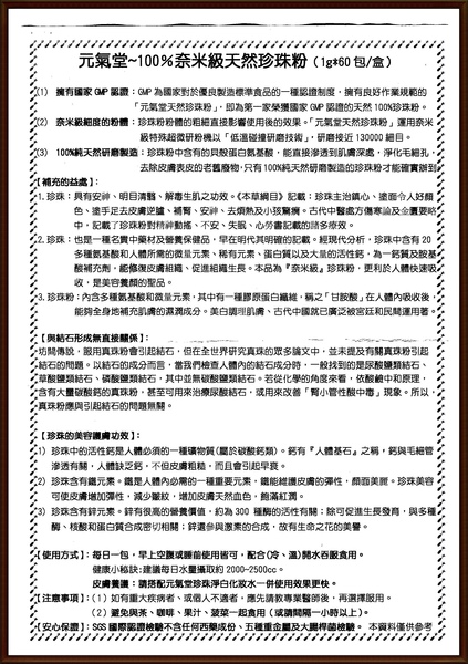 下圖是"元氣堂100%奈米級天然珍珠粉"的介紹,以及其使用方式. 陳小姐還提醒我,白天的時間要多喝水,說這樣可加速黑色素代謝!